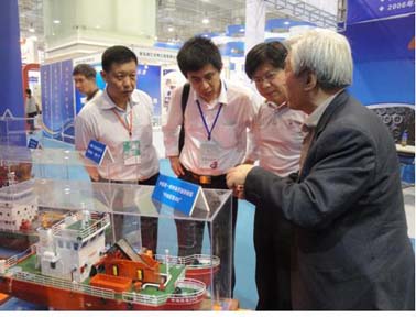 我公司的展品受到媒体的关注(红框) 徐总向客户介绍我公司设计建造的中国第一艘双体浮油回收船 展台吸引了众多参展者的关注